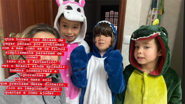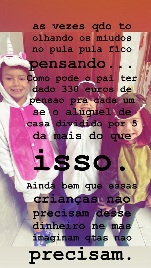 No Instagram, a apresentadora publicou longo desabafo na manhã desta sexta-feira (10). "Às vezes, quando estou olhando os miúdos no pula-pula, fico pensando... Como pode o pai ter dado 330 euros de pensão para cada um, se o aluguel da casa dividido por 5 dá mais do que isso? Ainda bem que essas crianças não precisam desse dinheiro, né, mas imagina quantas precisam?", disse.