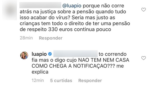 Nos comentários, uma internauta perguntou os motivos de Luana não recorrer em justiça do valor da pensão. "Por que não corre atrás na justiça sobre a pensão quando tudo isso acabar, do vírus? Seria mais justo, as crianças tem todo o direito de ter uma pensão de respeito, 330 euros continua pouco". A apresentadora imediatamente respondeu: "To correndo, fia (sic), mas o dito cujo não tem nem casa, como chega a notificação? Me explica", rebateu.