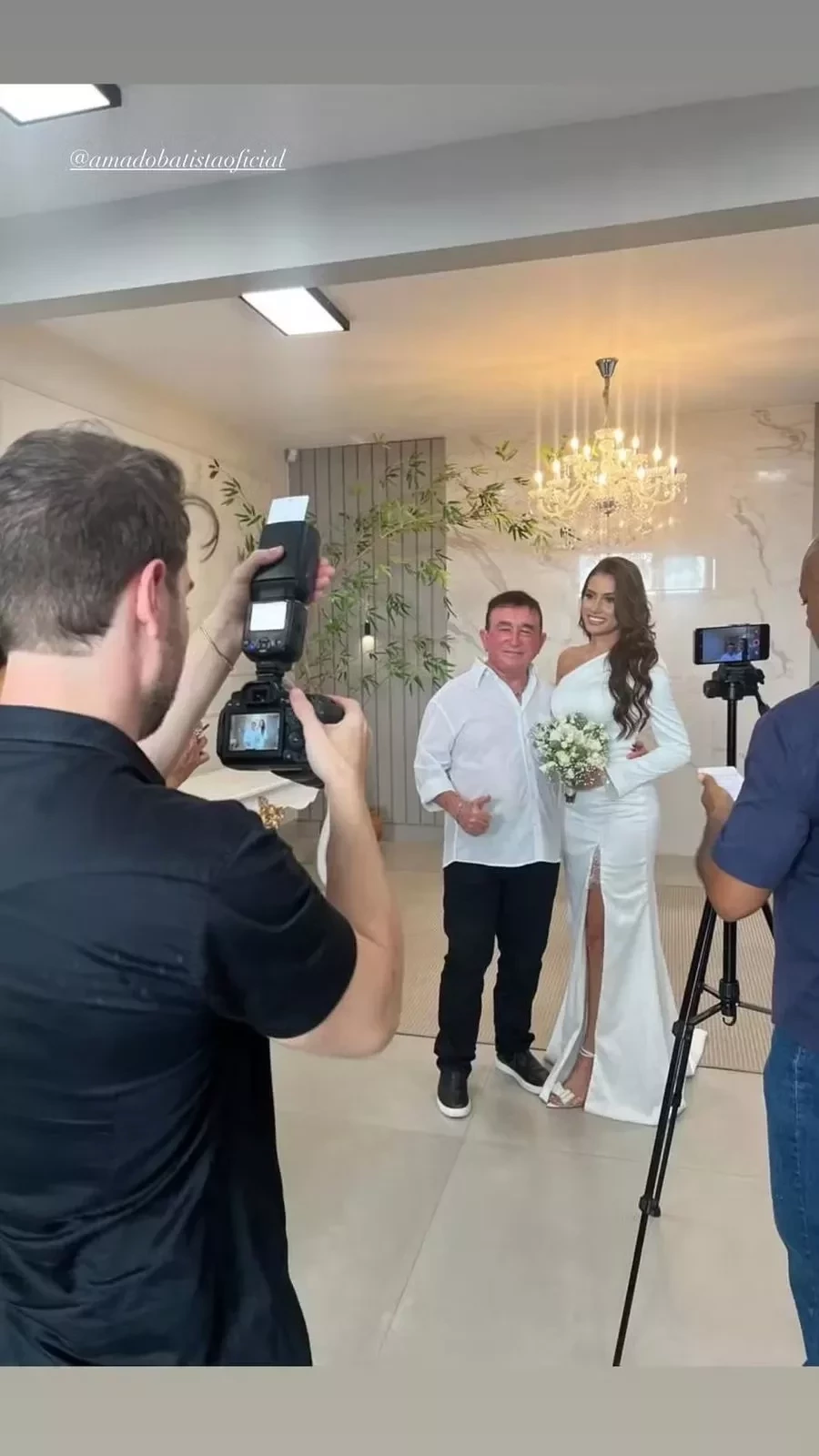 Em suas redes sociais, Calita compartilhou alguns momentos da preparação, incluindo a troca das alianças. Para a ocasião, ela escolheu um vestido branco com fenda na perna, manga longa e ombro à mostra, combinando com uma sandália branca com laço e um buquê de flores brancas. O cabelo solto e cacheado completou o visual. Já Amado Batista optou por um look mais simples, vestindo calça escura e camisa de botão.