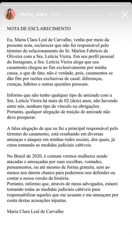 "Não fui responsável pelo término do relacionamento deles. Letícia alega que seu casamento chegou ao fim exclusivamente por minha causa, o que de fato não é verdade (...). Informo que não tenho qualquer tipo de amizade com a Sra. Letícia há mais de 2 anos, não havendo entre nós, nenhum tipo de vínculo ou obrigações. Portanto, qualquer alegação de traição de amizade não deve prosperar", disse ela, informando ainda que está recebendo diversos ataques nas redes sociais por conta das acusações da mulher de Marlon. "Já estou tomando as medidas judiciais cabíveis", desabafou Maria Clara na ocasião.