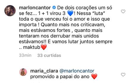 O post foi comentado pelo sertanejo. "De dois corações um só se fez. + virou 3. Nessa 'luta', toda o que venceu foi o amor e isso que importa. Quanto mais nos criticam, mais estávamos fortes. Quanto mais tentaram nos derrubar, mais unidos estávamos. E vamos lutar juntos sempre. Maktub", escreveu o cantor. "Promovido a papai do ano", respondeu Maria Clara, informando que o bebê vai se chamar Benício.