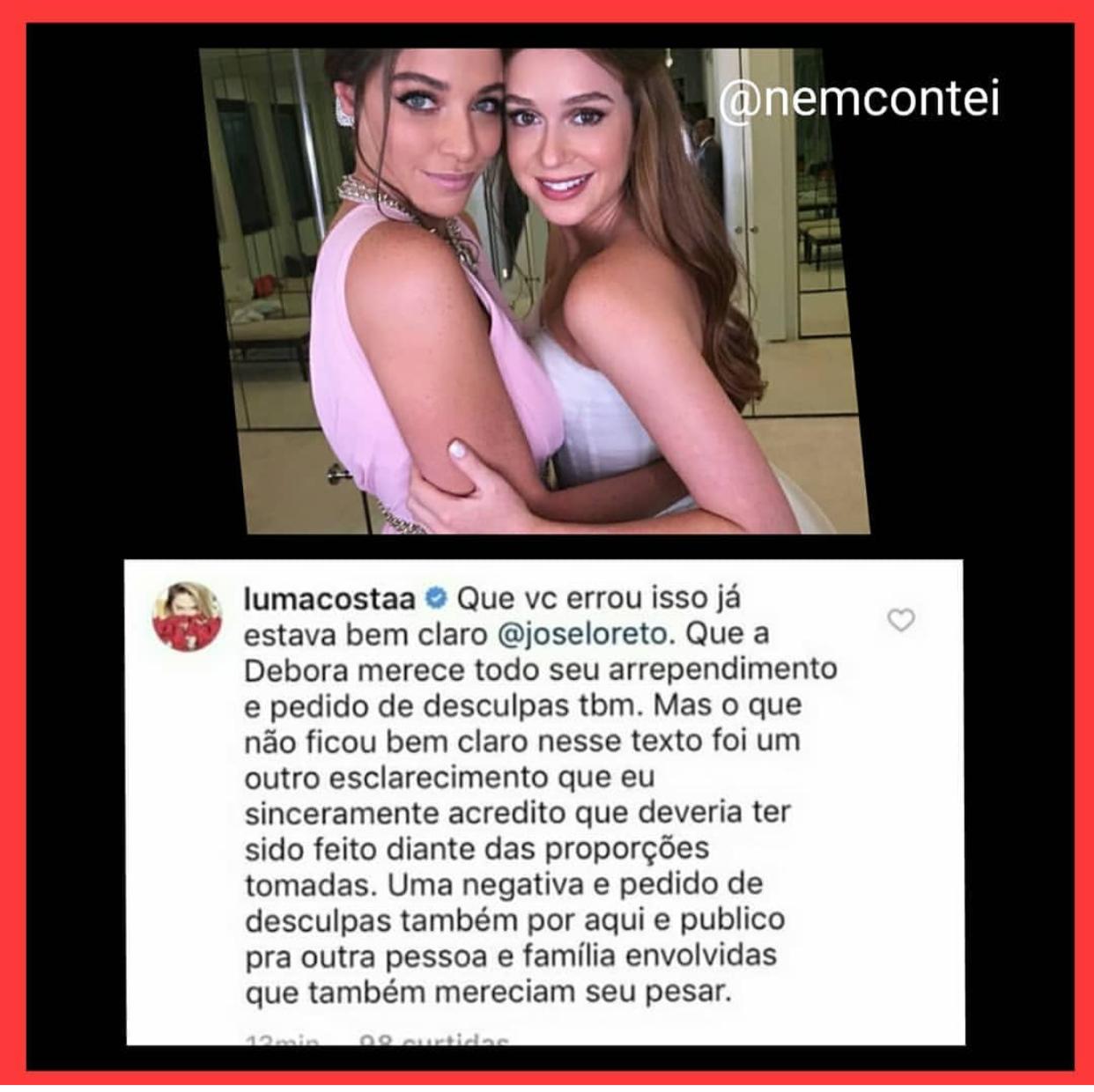 “Que você errou isso já estava bem claro José Loreto. Que a Débora merece todo seu arrependimento e pedido de desculpas também. Mas o que não ficou bem claro nesse texto foi um outro esclarecimento que eu sinceramente acredito que deveria ter sido feito diante das proporções tomadas. Uma negativa e pedido de desculpas também por aqui e público para outra pessoa e família envolvida, que também merecia seu pesar”, disparou a amiga de Marina Ruy Barbosa, da Globo.