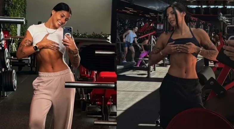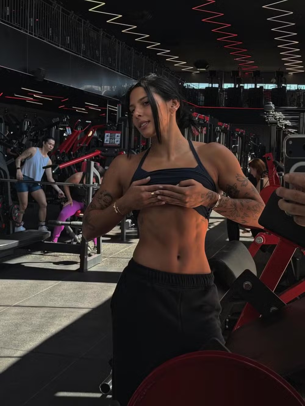 Ana Castela, de 22 anos, voltou a chamar atenção nas redes sociais ao compartilhar um momento do treino nesta terça-feira (28). A cantora mostrou o abdômen definido ao levantar a blusa e ainda divertiu os seguidores ao comentar sua nova pose favorita diante do espelho da academia.