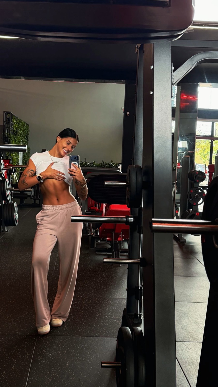 Para o treino, Ana escolheu um look confortável, com camiseta cropped branca, calça de moletom rosa mais soltinha e tênis claro. A produção casual destacou ainda mais a definição do abdômen no registro feito em frente ao espelho.