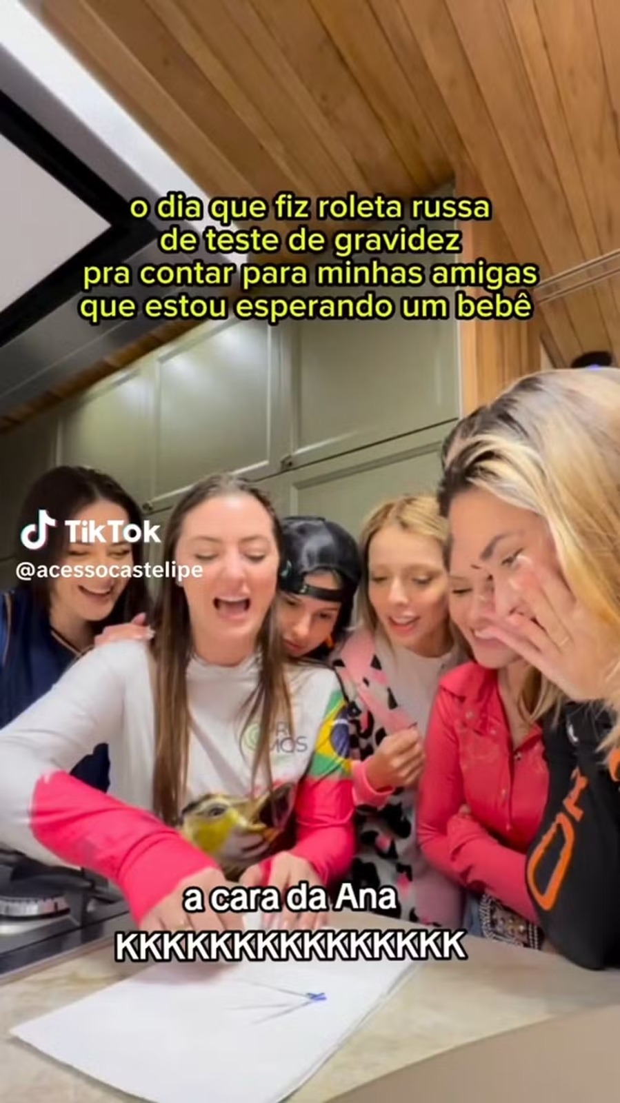 A ideia foi proposta por uma das amigas da artista, a influenciadora Luana Abbeg , que desejava revelar de uma forma diferente que vai ser mamãe. Ao ver que um dos testes era positivo, Castela se impressionou. Foi quando a amiga disse que era ela a gestante. "Sou eu", diz na gravação.