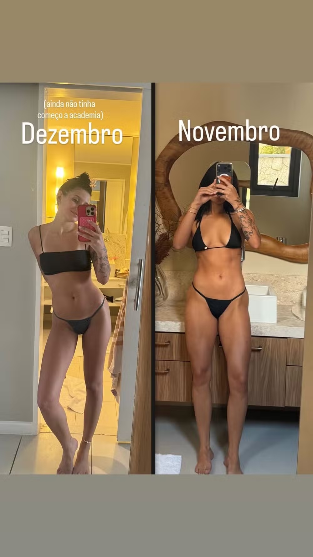 A artista compartilhou duas fotos: uma atual e outra de dezembro de 2024, período em que ainda não frequentava a academia. Nas imagens, feitas de biquíni, é possível ver o aumento da definição muscular no corpo da “Boiadeira”.