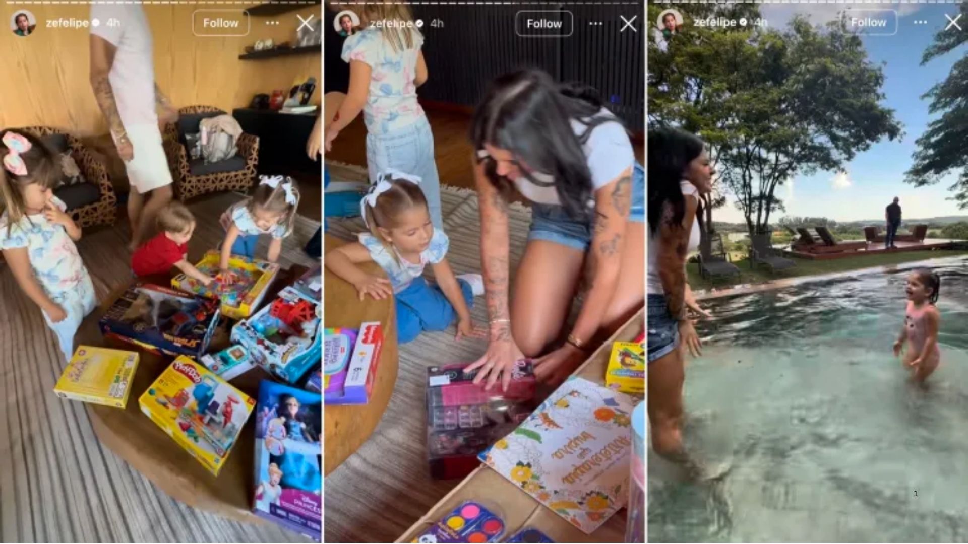 Segundo os registros divulgados pelo cantor, as crianças foram recebidas com abraços e ganharam brinquedos oferecidos por Ana Castela. A artista demonstrou entusiasmo ao brincar com os pequenos, reforçando o carinho que vem construindo com a família do namorado.