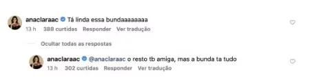 Ana Clara agitou os internautas nesta terça-feira (30) ao elogiar as fotos de Juliette. A ex-BBB comentou que o bumbum da colega estava "lindo", destacando que toda a aparência dela estava bonita, mas especialmente essa parte. Os seguidores de Juliette gostaram do comentário e responderam com emojis de choro de rir.