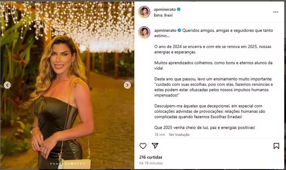 “Queridos amigos, amigas e seguidores que tanto estimo… Que 2025 venha cheio de luz, paz e energias positivas!”, escreveu Ana Paula, destacando que aprendeu lições importantes sobre as consequências das escolhas impulsivas.