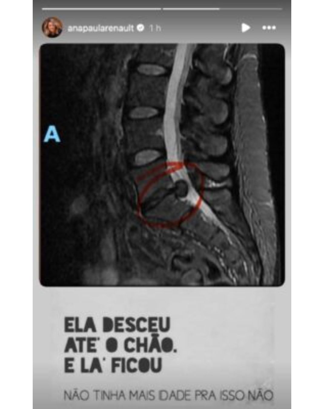 Ana Paula Renault contou que o quadro piorou devido ao impacto que o problema já causava em seu sistema nervoso. “Eles não me deram alta porque eu já estava tendo comprometimento neurológico, meu pé esquerdo já estava bobo e tá dormente até agora, eu não sinto os dedos. E eu vou fazer uma cirurgia de emergência mesmo. Uma cirurgia na coluna por causa de uma hérnia gigantesca”, explicou.