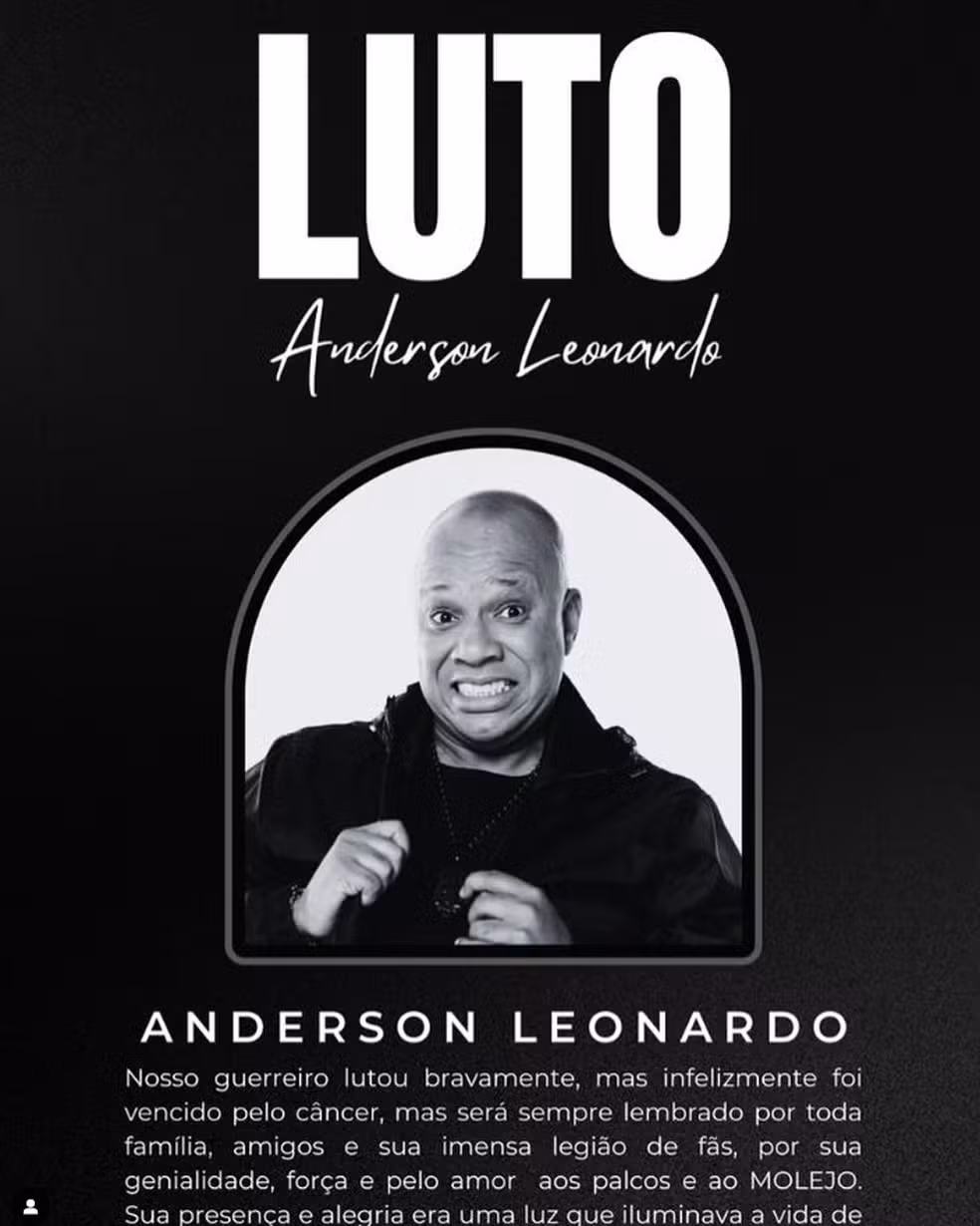 "Nosso guerreiro ANDERSON LEONARDO lutou bravamente, mas infelizmente foi vencido pelo câncer, mas será sempre lembrado por toda família, amigos e sua imensa legião de fãs, por sua genialidade, força e pelo amor aos palcos e ao MOLEJO. Sua presença e alegria era uma luz que iluminava a vida de todos ao seu redor, e sua falta será profundamente sentida e jamais esquecida, nós te amamos"., afirma a nota postada nas redes sociais.