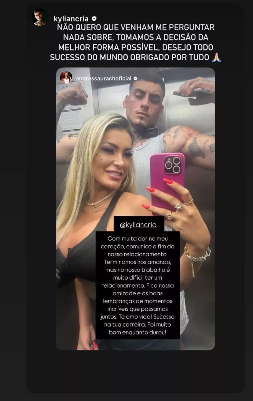 Com muita dor no meu coração, comunico o fim do nosso relacionamento. Terminamos nos amando, mas, no nosso trabalho, é muito difícil ter um relacionamento. Fica a nossa amizade e as boas lembranças de momentos incríveis que passamos juntos. Te amo, vida! Sucesso na tua carreira. Foi muito bom enquanto durou, escreveu Andressa