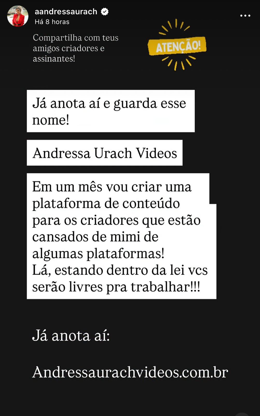 “Já anota aí e guarda esse nome! Andressa Urach Vídeos”, escreveu a influenciadora ao anunciar a iniciativa. Segundo ela, a plataforma será destinada a criadores que enfrentam restrições em outros espaços digitais. “Em um mês vou criar uma plataforma de conteúdo para os criadores que estão cansados de mimimi de algumas plataformas”, afirmou.