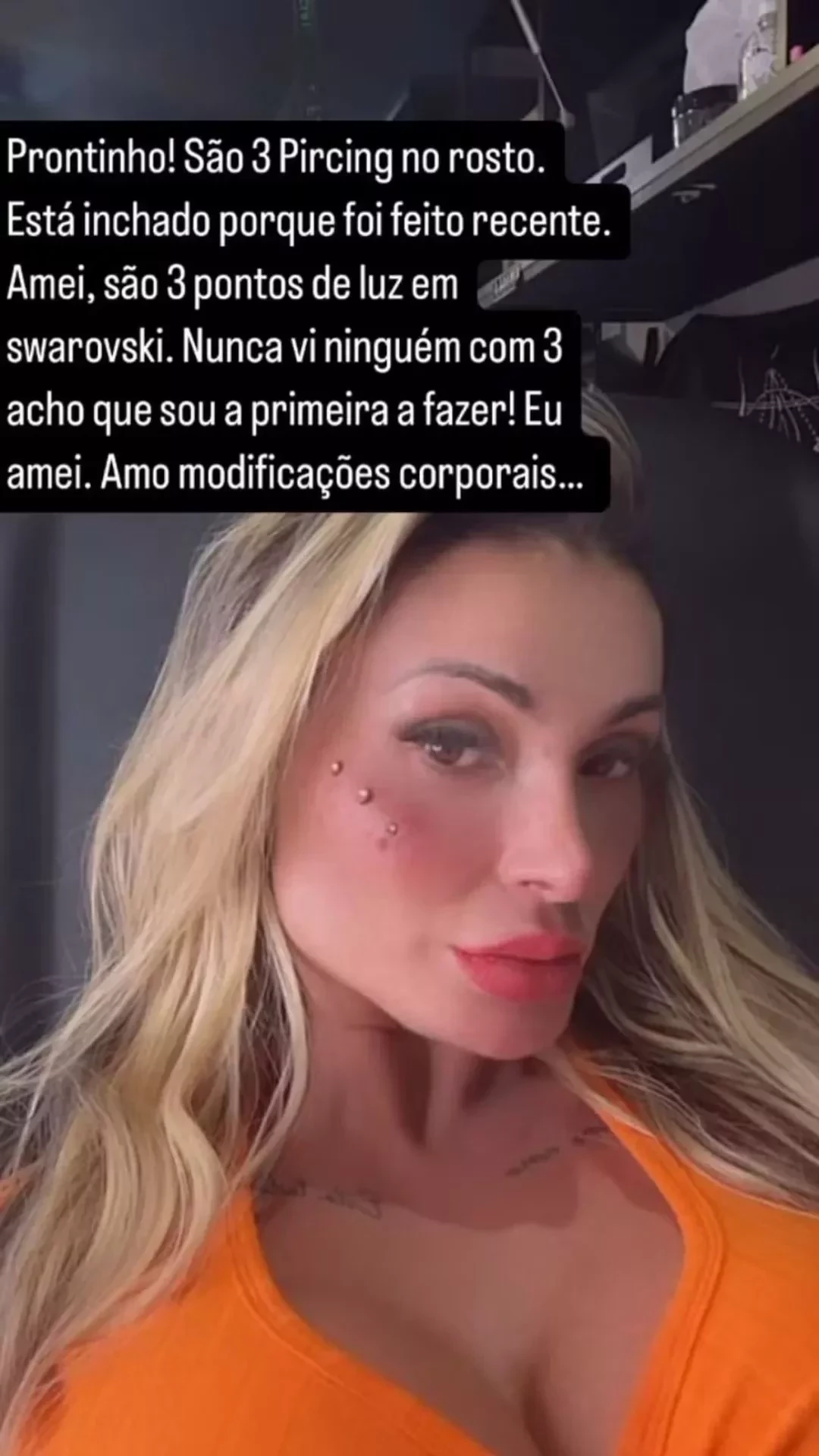 "São três pontos de luz em swarovski. Nunca vi ninguém com três. Acho que sou a primeira a fazer. Amo modificações corporais", escreveu ela, que acumula diversos procedimentos estéticos, bifurcação da língua e vem se dedicando a cobrir o corpo com tatuagens.