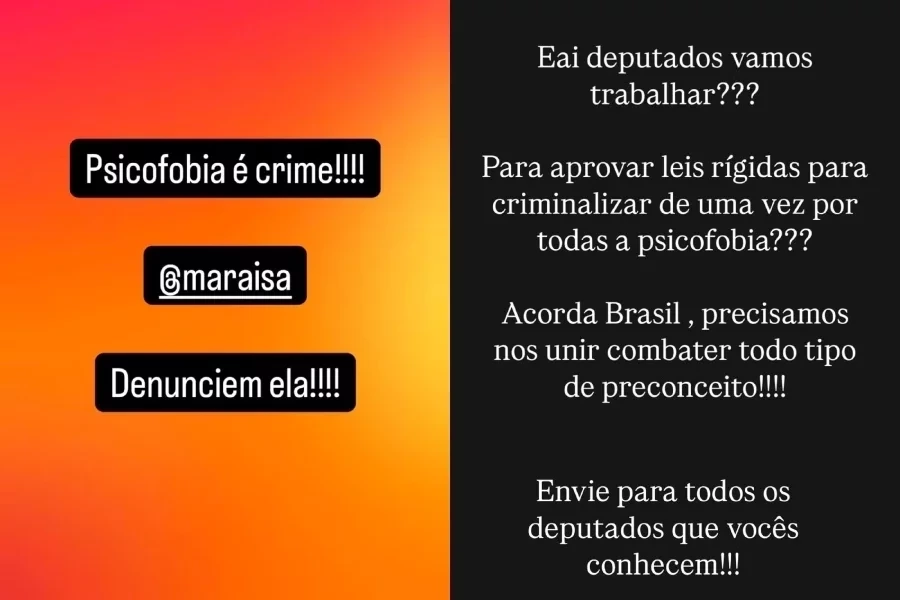 "Maraisa apagou a música do Instagram!!! Conseguimos!!! Mas a luta continua, denunciem mesmo assim ao Ministério Público!!! Pois o vídeo estava com milhares de visualizações e já abalou muitas pessoas!!! Precisamos lutar por justiça!!! Não se calem!!! Psicofobia tem que ser crime com leis rígidas para que as pessoas aprendam a respeitar os Borderlines. Juntos somos mais fortes!!!", disse.
