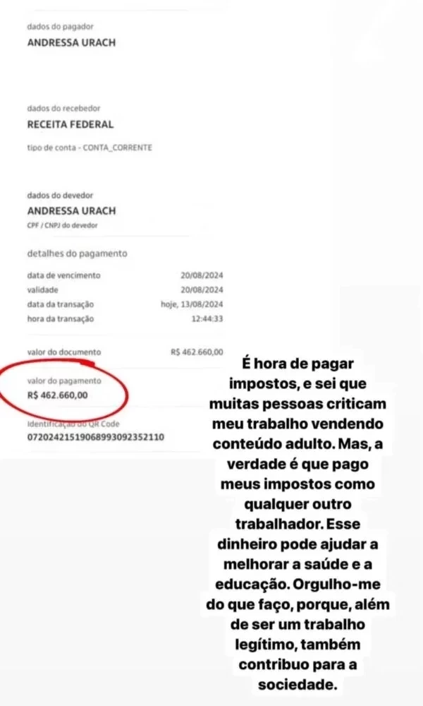 Na imagem, é possível ver o valor de R$ 462.660,00. Ela ainda aproveitou para alfinetar as pessoas que criticam sua "profissão". Urach também disse que tem orgulho do que faz e que paga seus impostos como qualquer outro trabalhador, contribuindo assim para a saúde e a educação.