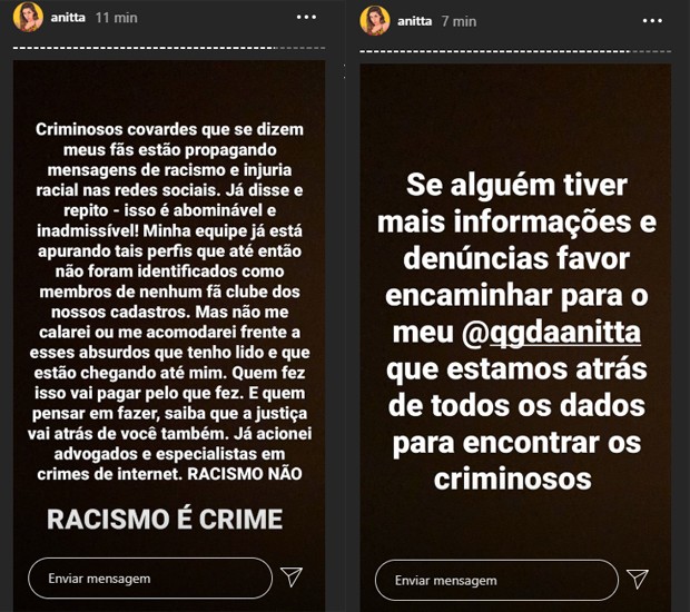 Anitta se manifestou, na madrugada de terça-feira (17), em seu Instagram Stories, depois que Ludmilla foi alvo de ataques racistas na web em meio às trocas de ofensas entre as duas."Criminosos covardes que se dizem meus fãs propagando mensagens de racismo e injúria racial nas redes sociais. Já disse e repito - isso é abominável e inadmissível!", escrcomeçou Anitta em seu desabafo. As informações são da Revista Quem.