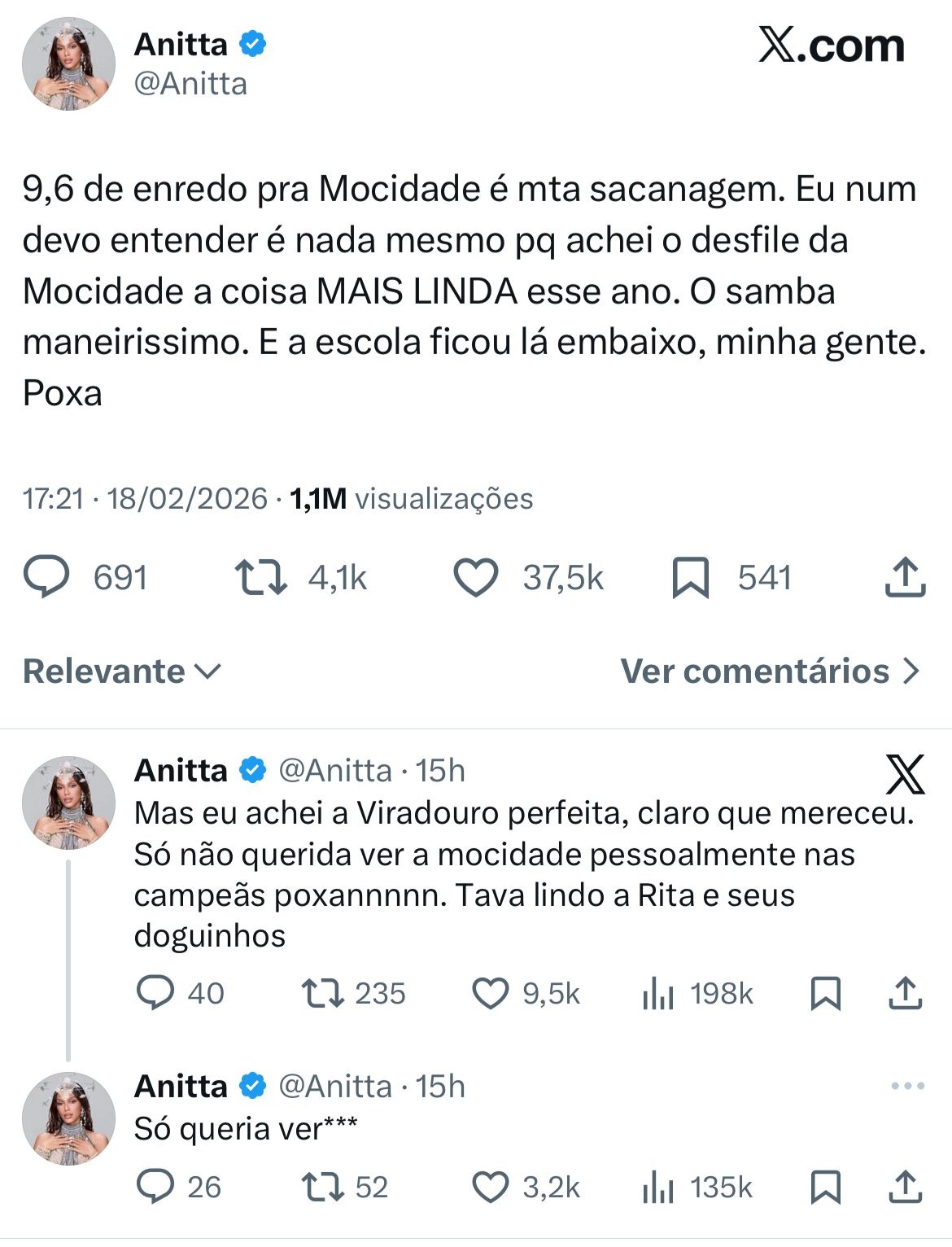 A Anitta criticou, nessa quarta-feira (18), o resultado da apuração do Carnaval 2026, que consagrou a Unidos do Viradouro como campeã do Grupo Especial. Em publicação no X, antigo Twitter, a artista afirmou não concordar com a nota 9,6 atribuída à Mocidade Independente de Padre Miguel no quesito samba-enredo.
