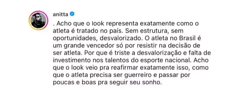 "Acho que o look representa exatamente como o atleta é tratado no país. Sem estrutura, sem oportunidades, desvalorizado. O atleta no Brasil é um grande vencedor só por resistir na decisão de ser atleta. Acho que o look veio pra reafirmar exatamente isso, como o atleta precisa ser guerreiro e passar por poucas e boas pra seguir seu sonho", escreveu a cantora.
