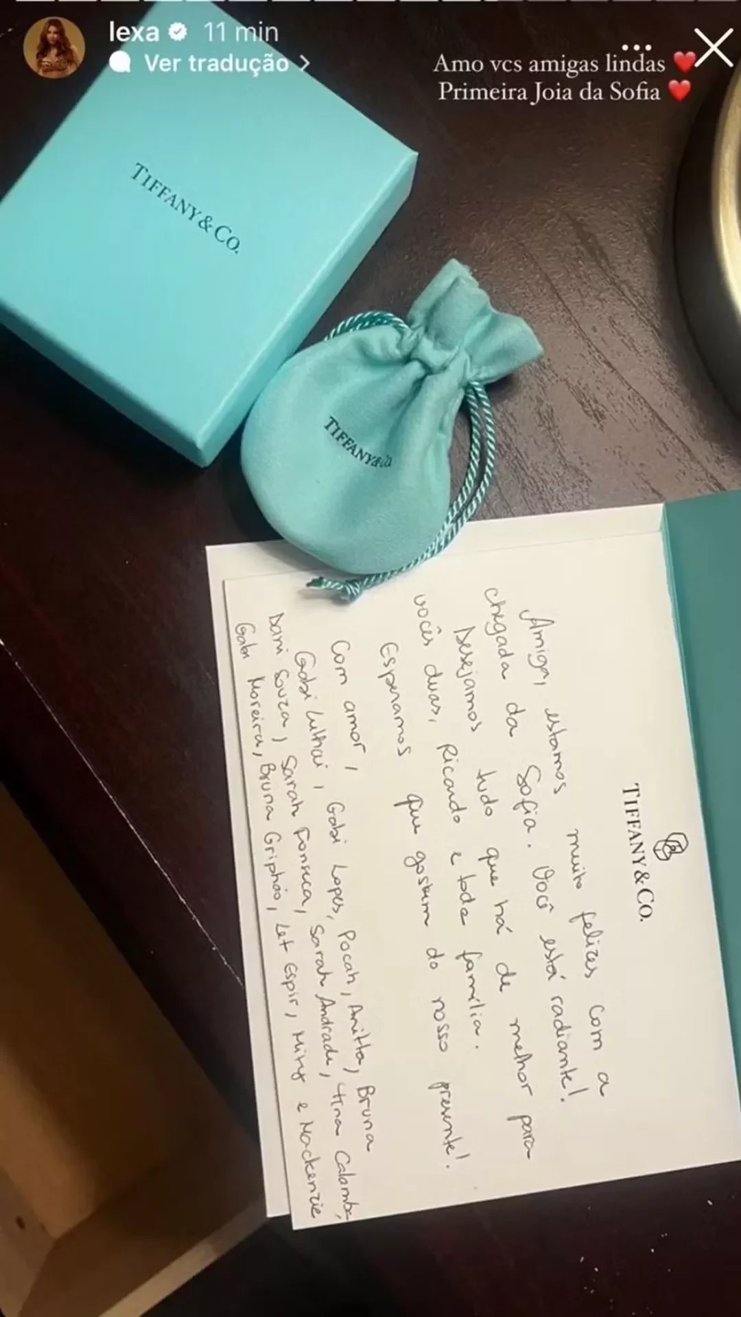 "Amiga, estamos muito contentes com a chegada da Sofia. Você está radiante. Desejamos o melhor para você, Ricardo e toda a família. Esperamos que apreciem nosso presente! Com carinho, Gabi Luthai, Gabi Lopes, Pocah, Anitta, Bruna, Dani Souza, Sarah Fonseca, Sarah Andrade, Gabi Moreira, Bruna Griphao", dizia o bilhete entregue a Lexa.