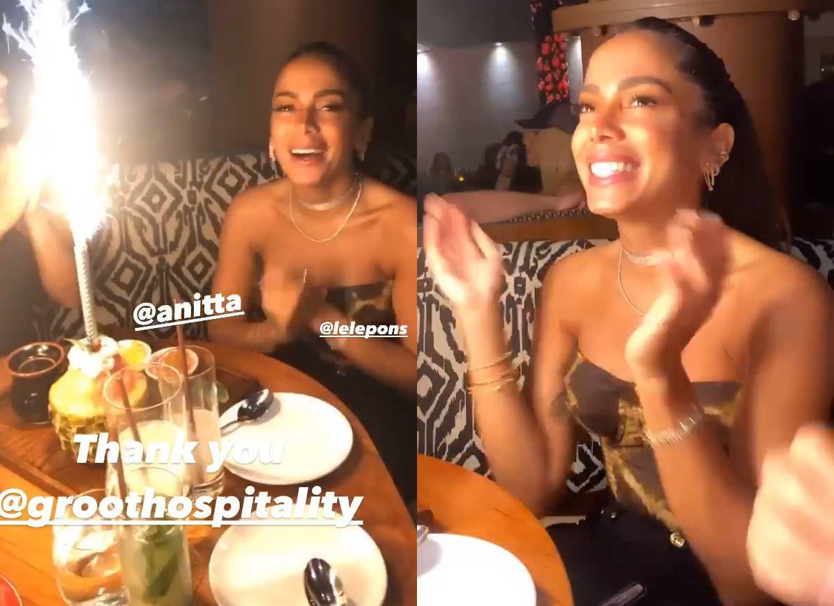 Em vídeos publicados pelas convidadas nas redes, Anitta ganhou um Happy Birthday to You, versão americana de Parabéns a Você, com direito a muitas velas com faíscas em diversos pratos de comida. "Esse é o terceiro dia que eles cantam 'Parabéns'", se divertiu a influencer venezuelana Lele Pons, uma das presentes na ocasião.