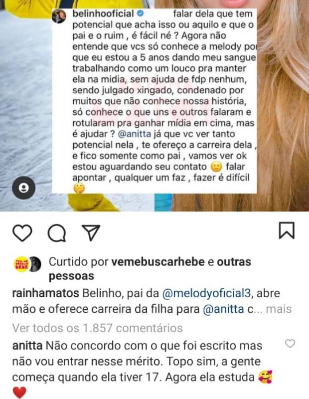 Horas depois, Anitta respondeu à oferta de Belinho. "Não concordo com o que foi escrito, mas não vou entrar nesse mérito. Topo, sim. A gente começa quando ela tiver 17 [anos]. Agora ela estuda", afirmou a cantora.