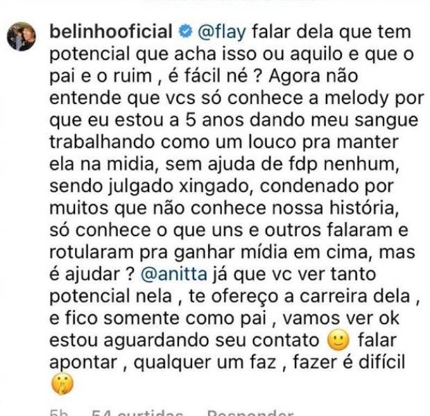 Não demorou muito para o comentário da cantora repercutir -- até a ex-BBB Flay disse que concordava com ela -- e MC Belinho acabou mandando um recado para Anitta, dando uma alfinetada na cantora. "Falar dela, que tem potecial, que acha isso ou aquilo e que o pai é ruim é fácil, né? Agora não entende que vocês só conhecem a Melody porque eu estou há cinco anos dando meu sangue, trabalhando como um louco para manter ela na mídia, sem ajuda de filho da put* nenhum, sendo julgado, xingado, condenado por muitos que não conhecem a nossa história, só conhecem o que uns e outros falaram e rotularam para ganhar mídia em cima", declarou ele.