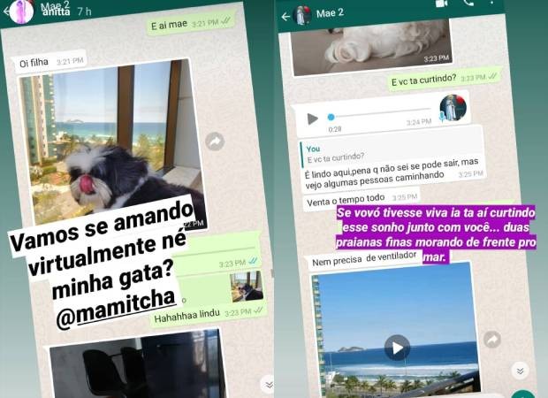 "Se vovó estivesse viva, estaria aí curtindo esse sonho junto com você. Duas praianas finas morando de frente para o mar", escreveu Anitta. A cantora mostrou ainda os diversos áudios que ela e a mãe têm trocado.