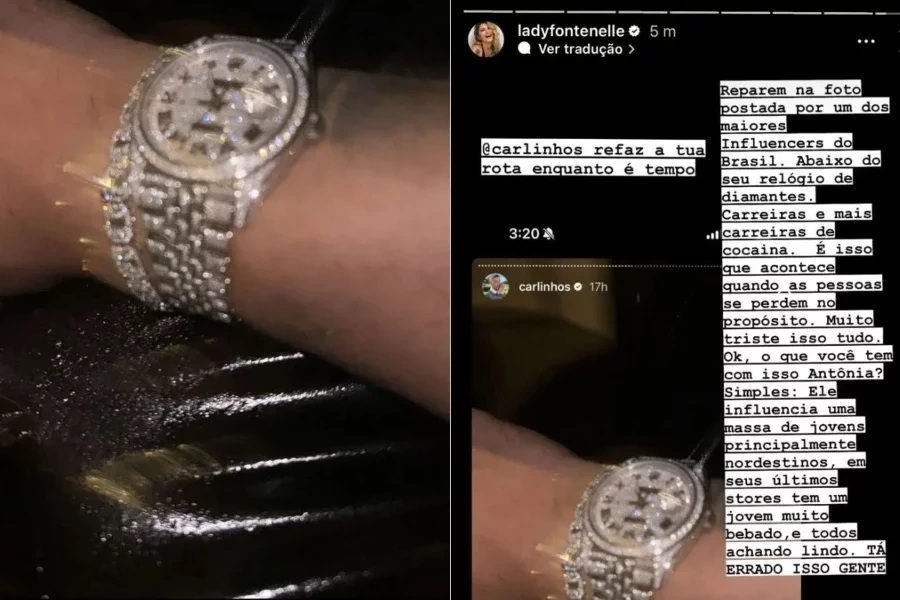 Nos stories de seu perfil, a apresentadora lamentou a postura do influenciador: "Carlinhos Maia, refaz tua rota enquanto é tempo. Reparem na foto postada por um dos maiores influenciadores do Brasil. Abaixo do seu relógio de diamantes, carreiras e mais carreiras de cocaína. É isso que acontece quando as pessoas se perdem no propósito", acusou ela.