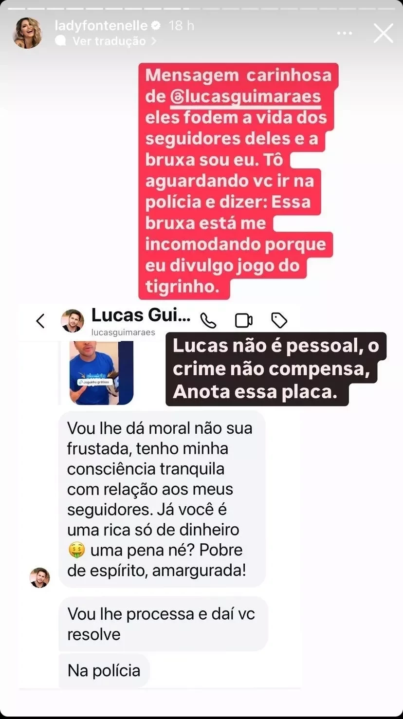 Guimarães, por sua vez, respondeu às críticas de Fontenelle por mensagem privada no Instagram, mas teve sua resposta exposta pela influenciadora nos Stories. Ele a criticou e ameaçou processá-la caso ela continuasse mencionando seu nome. "Vou lhe processar e daí você resolve na polícia", disse ele.