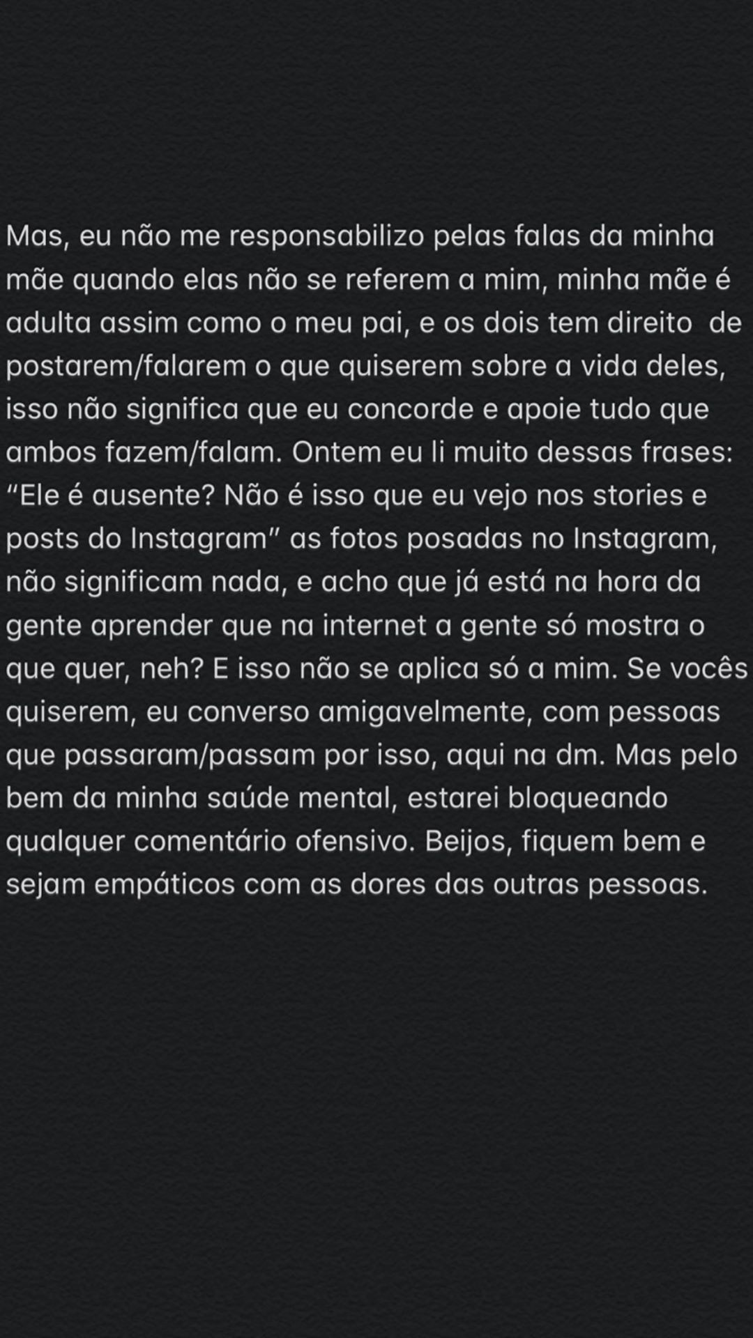 "Mas, eu não me responsabilizo pelas falar da minha mãe quando elas não se referem a mim. Minha mãe é adulta, assim como o meu pai, e os dois têm direito de postarem/falarem o que quiserem sobre a vida deles, isso não quer dizer que eu concorde e apoie tudo que ambos fazem/falam", continuou.
