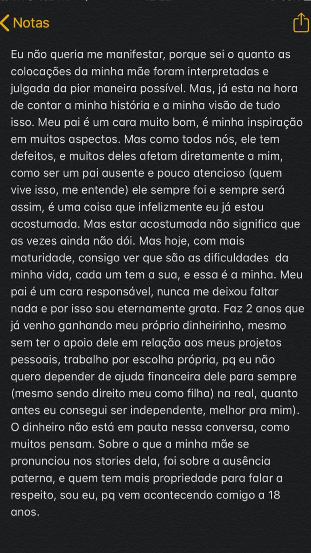 "Meu pai é um cara responsável, nunca me deixou faltar nada e por isso sou eternamente grata. Faz dois anos que venho já ganhando meu próprio dinheiro, mesmo sem ter o apoio dele nos meus projetos pessoais. Trabalho por escolha própria, porque não quero depender de ajuda financeira dele para sempre, mesmo sendo direito meu como filha. Quanto antes eu conseguir ser independente, melhor para mim. O dinheiro não está em pauta nessa conversa, como muitos pensam. Sobre o que a minha mãe se pronunciou, foi sobre a ausência paterna e quem tem mais propriedade para falar a respeito sou eu, porque vem acontecendo comigo há 18 anos".