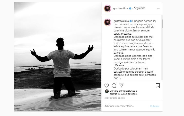 A imagem realmente é antiga e já havia sido postada por Gusttavo em janeiro de 2018 com um texto sobre desilusão. No último sábado, Gusttavo fez sua primeira live após anunciar a separação. Abatido, ele interagiu pouco e fãs diziam que ele aparentava estar muito triste.