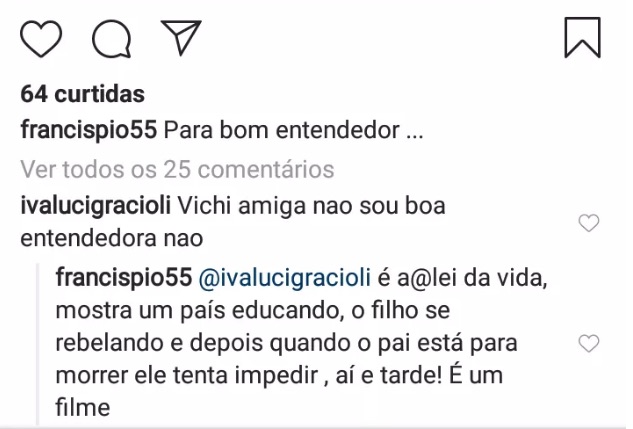 Em um outro post, ela ainda compartilhou uma imagem de um homem com o filho no colo e ressaltou: "Para bom entendedor...". Em poucos minutos, os fãs apontaram uma indireta para Scooby e Francis se pronunciou: "É a lei da vida, mostra um pai educando, o filho se rebelando e depois quando o pai está para morrer ele tenta impedir, aí e tarde! É um filme", confirmou.