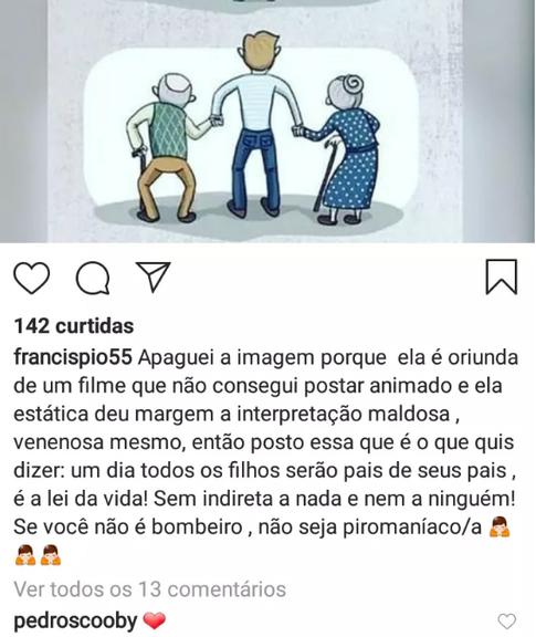 "Apaguei a imagem porque ela é oriunda de um filme que não consegui postar animado e ela estática deu margem a interpretação maldosa, venenosa mesmo, então posto essa que é o que quis dizer: um dia todos os filhos serão pais de seus pais, é a lei da vida! Sem indireta a nada e nem a ninguém! Se você não é bombeiro, não seja piromaníaco/a", escreveu ela.