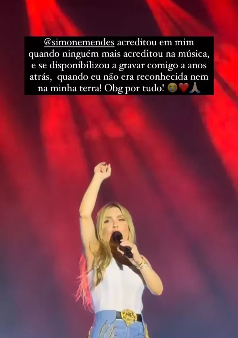"Simone Mendes acreditou em mim quando ninguém mais acreditou na música e se disponibilizou a gravar comigo anos atrás, quando eu não era reconhecida nem na minha terra! Obrigada por tudo."