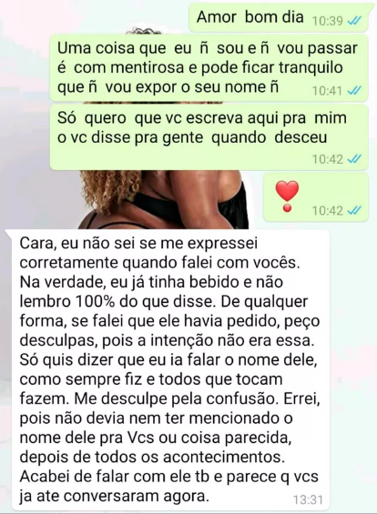 "Tava conversando com o Pedro agora e ele não está mentindo em nada. Ele botou o print simplesmente para mostrar que uma pessoa chegou lá na roda, o DJ, falando que ele fez isso e ele não fez nada disso, não houve isso. Mas que a pessoa chegou lá e falou e tem um monte de gente provando que foi falado isso, acontece", disse.