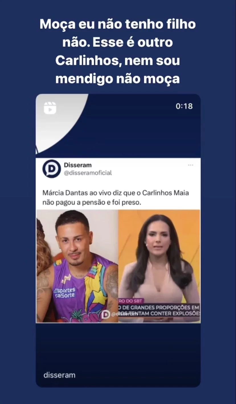"Gente, o humorista Carlinhos, que ficou conhecido pelo personagem Mendigo, você se lembra, né? Ele vai passar por audiência de custódia porque foi preso em São Paulo. O motivo? Mais uma vez o Carlinhos Maia não pagou pensão!", declarou a jornalista.