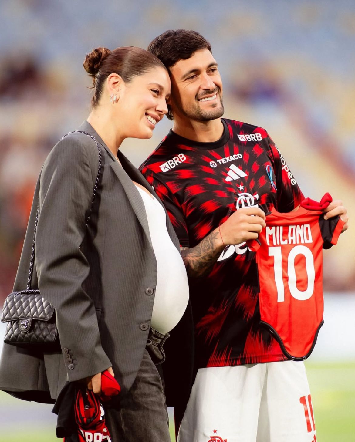 O nome do bebê já havia sido divulgado no início de novembro, durante uma homenagem do Flamengo ao meia, que renovou contrato até 2028. Na ocasião, o casal posou com um body estampado com “Milano” e o número 10, o mesmo utilizado por Arrascaeta no clube.