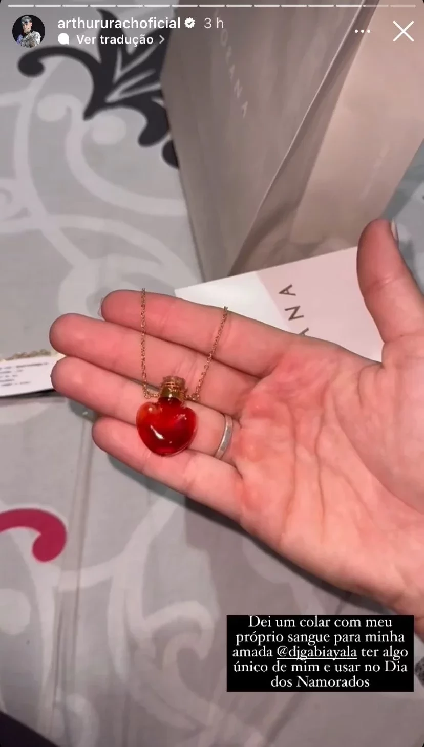 Arthur Urach, filho de Andressa Urach, surpreendeu a namorada com um presente diferente. Para comemorar a proximidade do Dia dos Namorados, o influenciador presenteou Gabi Ayla com um colar, com um pingente em formato de coração, contendo seu próprio sangue.
