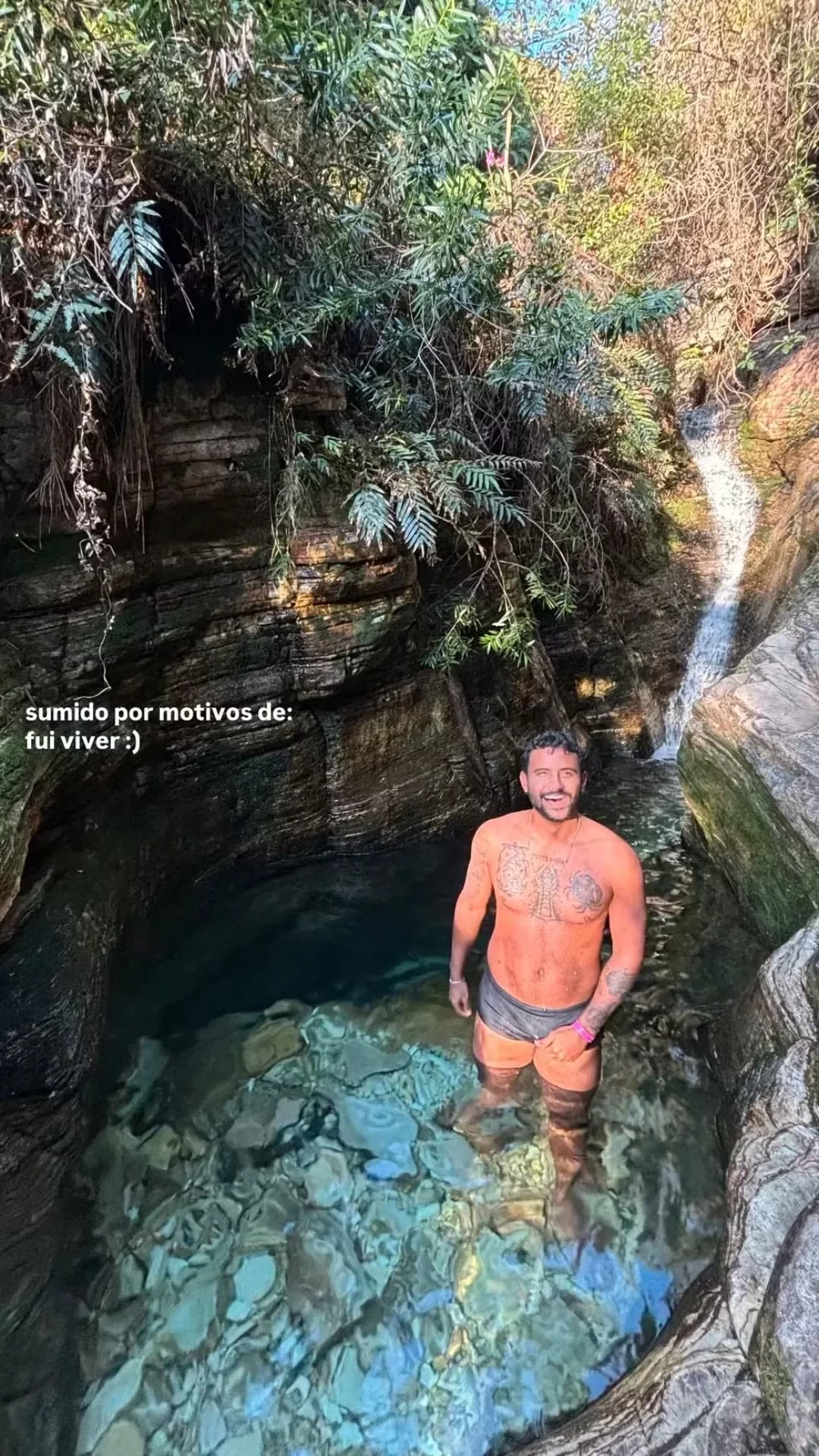 "Sumido por motivos de: fui viver", escreveu Pizane em uma foto na cachoeira. "Vendo o pôr do sol mais lindo do mundo do topo da cachoeira", ainda mostrou Pizane, que desceu de bunda em cima de uma das pedras do local.