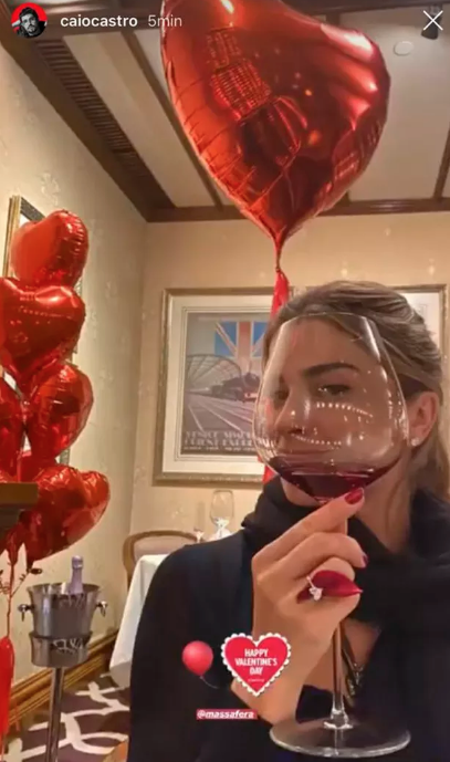 Caio Castro postou uma foto de um jantar romântico com Grazi Massafera, celebrando o Valentine's Day, o dia dos namorados dos Estados Unidos. Com a atriz segurando uma taça de vinho na mão e cercada de balões de coração, o ator inseriu um desejo de "Feliz Dia dos Namorados" e marcou o perfil de Grazi na foto.