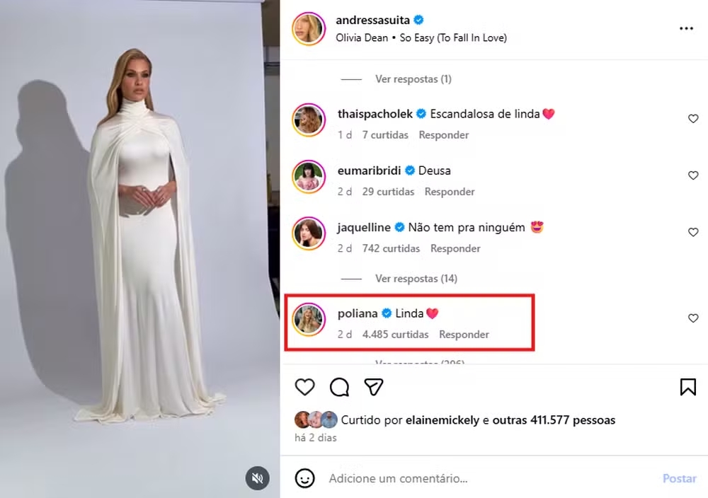 Apesar das reações negativas, a influenciadora recebeu apoio de alguns seguidores. “Poli sempre elogia outras mulheres nas redes, não é diferente agora. Vocês é que criam rivalidade onde não existe”, defendeu uma fã.