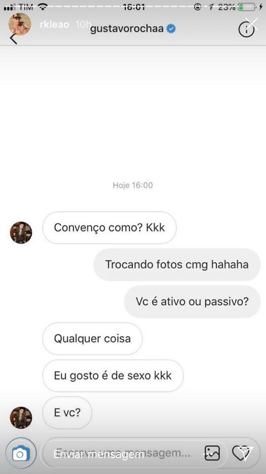 “Sobre falar que preciso provar que não sou uma pessoa ruim, não é a questão da sexualidade. É que eu estou tendo que provar que não sou mentiroso, porque o menino está fazendo eu me passar por mentiroso”, finalizou Gustavo Rocha, mudando de assunto imediatamente. Posteriormente, o ator pornô surpreendeu e publicou novos prints comprometedores.