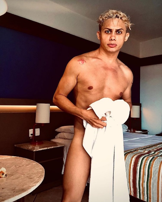 Silvero Pereira esquentou o clima da web ao posar completamente nu em um quarto de hotel. O ator cobrou a frontal apenas com uma toalha branca, destacando as laterais do bumbum em clique. As informações são do Observatório dos Famosos.