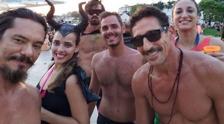 No ar em "O sétimo guardião" como o conquistador Mattoso, Tuca Andrade, de 54 anos, foi visto aos beijos com um rapaz na rua no bloco Technobloco, que circulou pela Zona Portuária, no Centro do Rio, na última terça-feira.