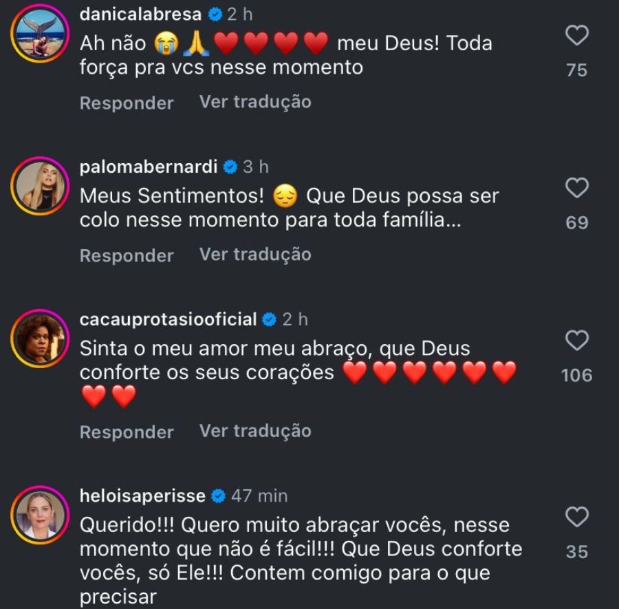 O casal, que anunciou a gestação em fevereiro deste ano, recebeu muitas mensagens de força e carinho dos amigos. "Sintam o meu amor, meu abraço, que Deus conforte os seus corações", postou a atriz Cacau Protásio. "Meus sentimentos! Muita força, amores!", escreveu a apresentadora Angélica. "Todo o meu amor pra vocês! Eu sinto muito", postou a atriz Jeniffer Nascimento. "Sinto muito. Vibrando muito amor para vocês", escreveu a atriz Bárbara Borges.