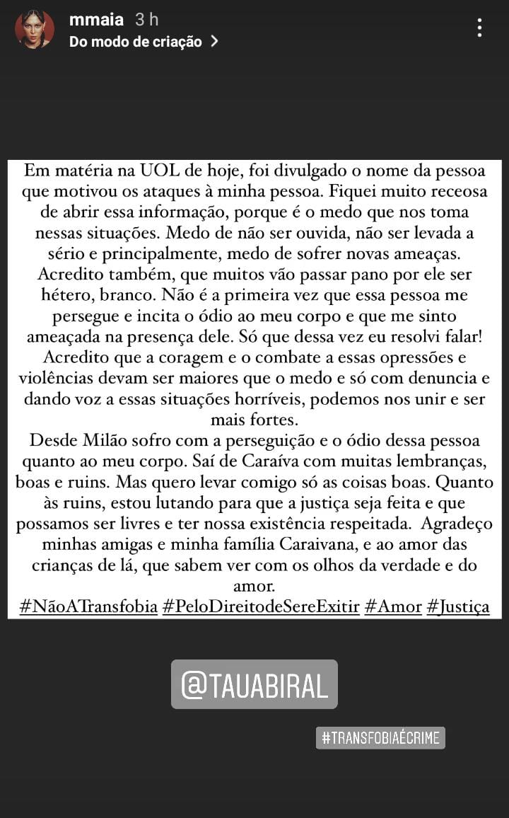 Ainda nos stories, ela relatou que inicialmente teve medo de citar nomes por medo de não ser ouvida, mas desta vez resolveu falar. "Desde Milão sofro com a perseguição e o ódio dessa pessoa quanto ao meu corpo. Saí de Caraíva com muitas lembranças, boas e ruins [...]. Estou lutando para que a justiça seja feita e que possamos ser livres e ter nossa existência respeitada",escreveu ela, em postagem na tarde desta sexta-feira (24).
