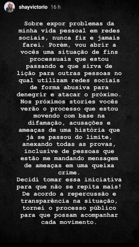 "Sobre expor problemas da minha vida pessoal em redes sociais, nunca fiz e jamais farei. Porém, vou abrir a vocês uma situação de fins processuais que estou passando e que sirva de lição para outras pessoas no qual utilizam redes sociais de forma abusiva para denegrir e atacar o próximo. Nos próximos stories vocês verão o processo que estou movendo com base na difamação, acusações e ameaças de uma história que já passou do limite, anexando todas as provas, inclusive de pessoas que estão me mandando mensagem de ameaças em uma queixa crime. Decidi tomar essa iniciativa para que não se repita mais! De acordo com a repercussão e transparência na situação, tornei o processo público para que possam acompanhar cada movimento", escreveu a gamer em um longo desabafo na rede social.