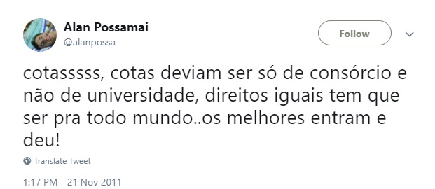 Em outra publicação, de 2011, Alan questionou o sistema de cotas raciais: "Cotas deviam ser só de consórcio e não de universidade, direitos iguais têm que ser pra todo mundo. Os melhores entram e deu!".
